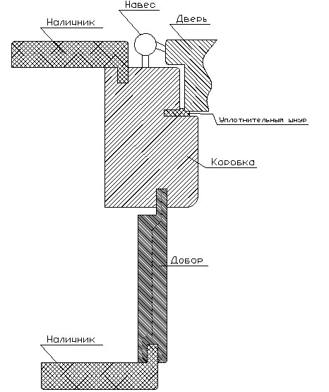 Толщина полотна 46мм, выполнена с притвором (наплывом). Коробка сечением 90мм*60мм оснащена уплотнительным шнуром. Дверь укомплектована магнитным замком (без ручки). Навесы 4-х штыревые с колпачками в цвет изделия (позволяют легко отрегулировать положение двери по вертикали и горизонтали). Наличник выполнен с клювом 10мм, что вместе с добором, монтируемым в специальные пазы в коробке, позволяет легко нивелировать неровность стен.